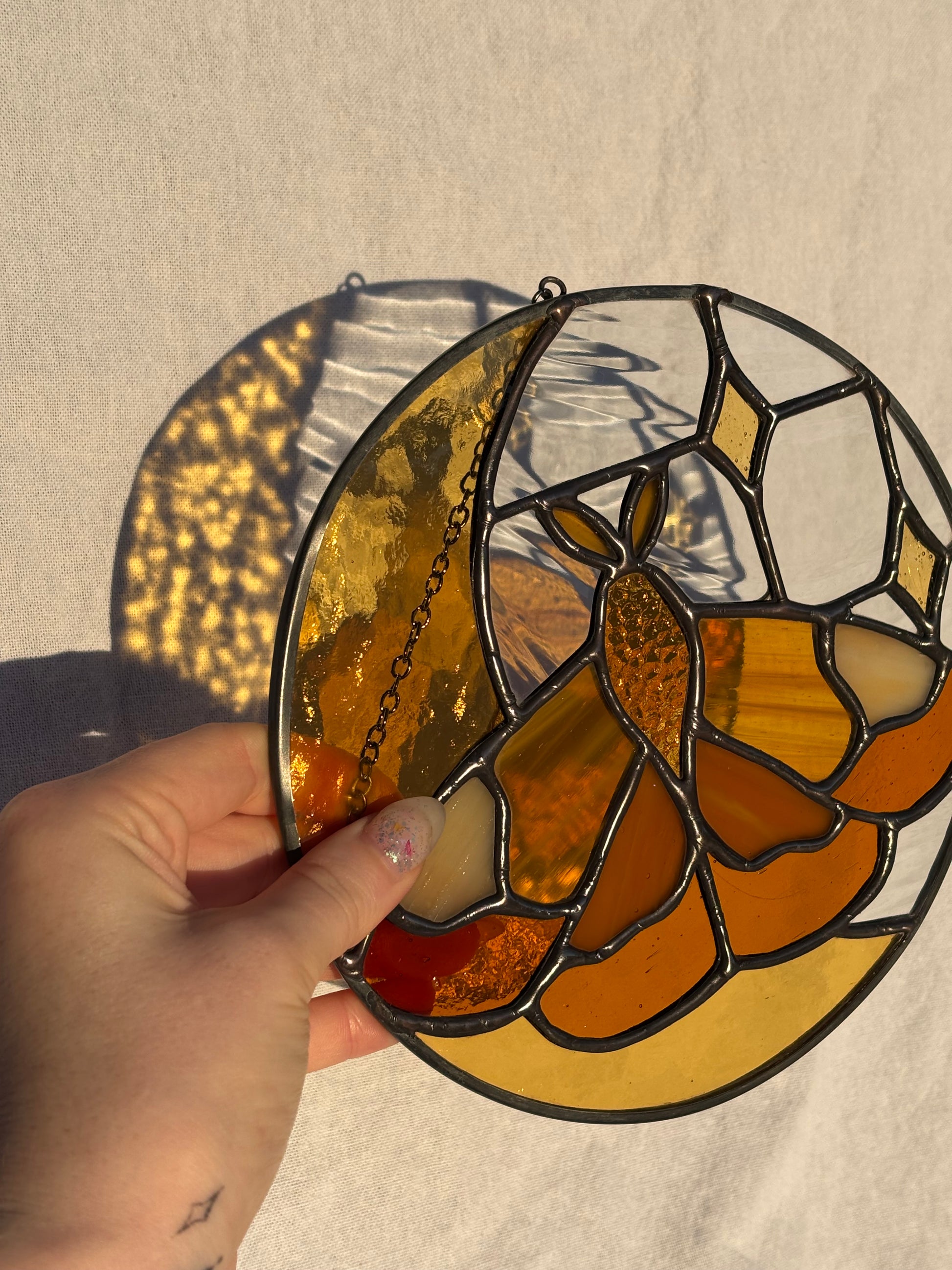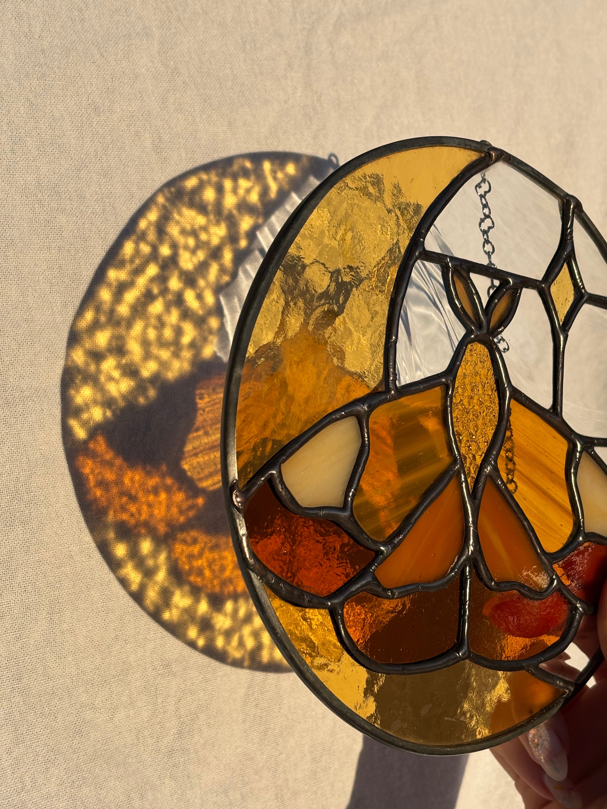 A dreamy combination of warm amber glass and delicate detailing, this stained glass suncatcher features a moth resting against a glowing crescent moon. Each piece of glass is carefully selected for its texture and shimmer, allowing the sunlight to bring the design to life with golden reflections.