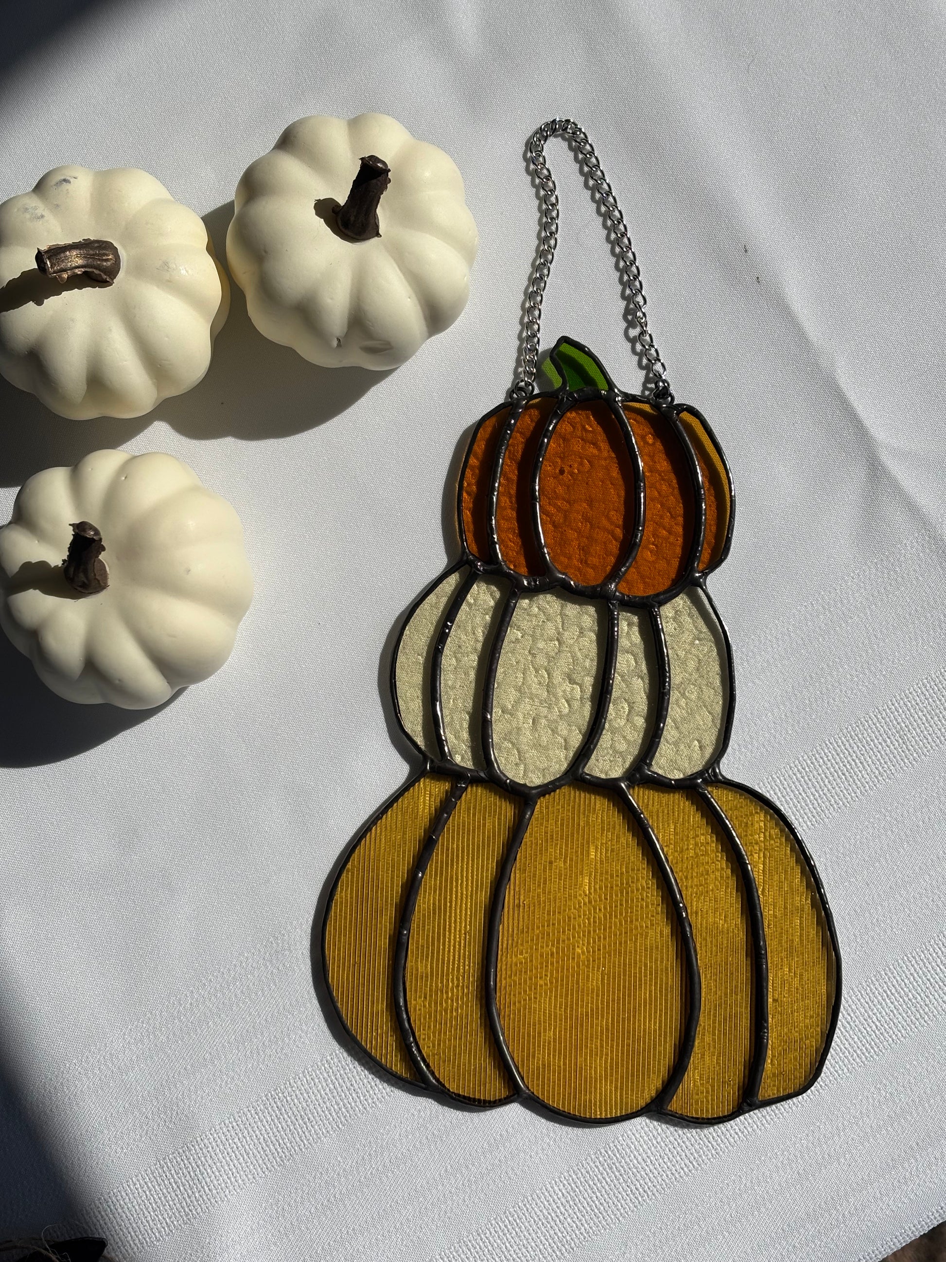 Celebrate the cozy charm of autumn with this playful stacked pumpkin design. Featuring three whimsical pumpkins in a tiered arrangement, this stained glass pattern offers a mix of curves and flowing lines that are approachable for most makers while still delivering a striking finished piece.