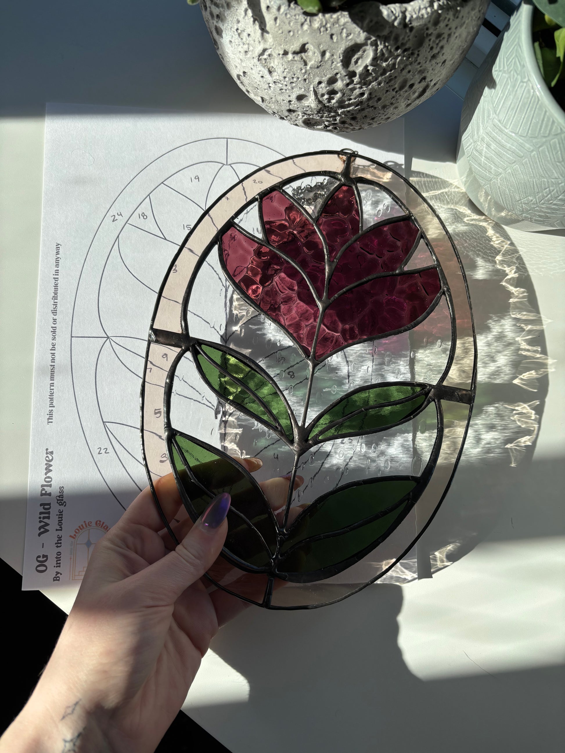 A classic take on wild beauty, this pattern features a detailed floral design with soft curves and layered petals. The finished piece measures approximately 10” x 8”, making it a striking sun catcher or a beautiful addition to any gallery wall.